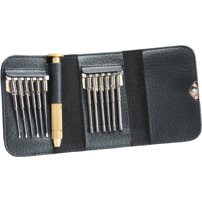 Kleines Set aus Schraubendrehern, ideal für die Brillen-Reparatur geeignet. Das Set besteht aus:1 Schraubendrehergriff4 Kreuzschlitz Einsätze: 1.5, 1.7, 2.0, 2.54 Schlitz Einsätze: 1.5, 1.7, 2,0, 2,5mm3 Außen Sechskant Einsätze: 2mm, 2,3mm, 2,5mm1 Außen Torx Einsatz: TN8im Kunstleder-Etui - Installation / Reinigung Werkzeuge