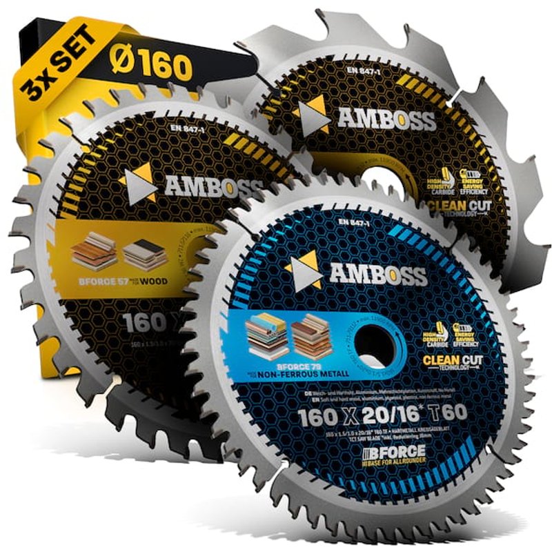 " Die Kreissägeblatt-Sets von Amboss sind vielseitig einsetzbar und eignen sich ideal für das Schneiden von Holz, Holzwerkstoffen, beschichteten Platten, Ne-Metallen wie Aluminium und Kunststoffen. Diese Sets ermöglichen sowohl schnelle grobe als auch feine Schnitte und bestehen jeweils aus drei Sägeblättern mit grober, mittlerer und feiner Verzahnung. Sie sind kompatibel mit gängigen Akku Hand- und Tischkreissägen von Herstellern wie Bosch, Festool, Mafell, Dewalt und vielen anderen.