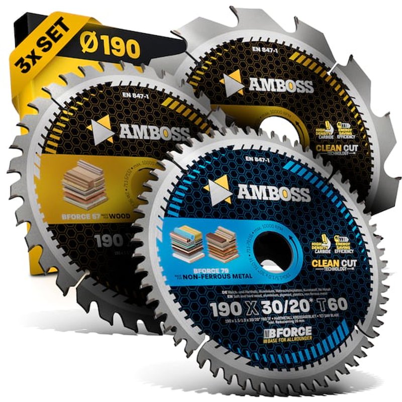 " Die Kreissägeblatt-Sets von Amboss sind vielseitig einsetzbar und eignen sich ideal für das Schneiden von Holz, Holzwerkstoffen, beschichteten Platten, Ne-Metallen wie Aluminium und Kunststoffen. Diese Sets ermöglichen sowohl schnelle grobe als auch feine Schnitte und bestehen jeweils aus drei Sägeblättern mit grober, mittlerer und feiner Verzahnung. Sie sind kompatibel mit gängigen Akku Hand- und Tischkreissägen von Herstellern wie Bosch, Festool, Mafell, Dewalt und vielen anderen