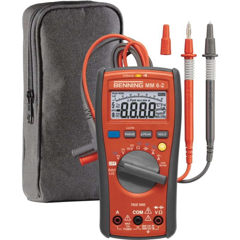 TRMS-Digital-Multimeter MM 6-2 4-stellige, beleuchtete LCD-Anzeige (6000 Punkte) Gleich-/ Wechselspannung (0,1 mV-1000 V), Gleich-/ Wechselstrom (1 mA-10 A), Widerstand (0,1 -40 M), Frequenz (0,01 Hz-100 kHz), Kapazität (1 nF-10 mF) Durchgangsprüfung (20 ) (rote LED/Summer)/ Diodenprüfung (1,5 V) Präzise durch Echt-Effektivwertmessverfahren TRUE RMS AutoV-Funktion für automatische AC/DC-Spannungserkennung und niedriger Eingangsimpedanz (LoZ) zur Unterdrückung von kapazitiv/induktiv eingestreuten Spannungen Integrierter Voltsensor signalisiert berührungslos Phasenspannungen und Kabelbrüche in Leitungen (optisch/akustisch), einpolige Phasenprüfung Automatische/ manuelle Bereichswahl, automatische Abschaltung, Batterieunterspannungsanzeige Messwert- (HOLD), Spitzenwertspeicher (PEAK), Relativmessung (REL) Messkategorie CAT IV 600 V, CAT III 1000 V Inkl. Gummischutzrahmen mit Magnetaufhänger, Tasche, Batterie (1x9 V Block/ LR61), Messleitungen Anzeige digital Maßstabsei - Install.Baumaterial Werkzeug Messgeräte Messgeräte - BENNI Digital-Multimeter MM6-2 TRMS 1000VACDC CAT IV 044087