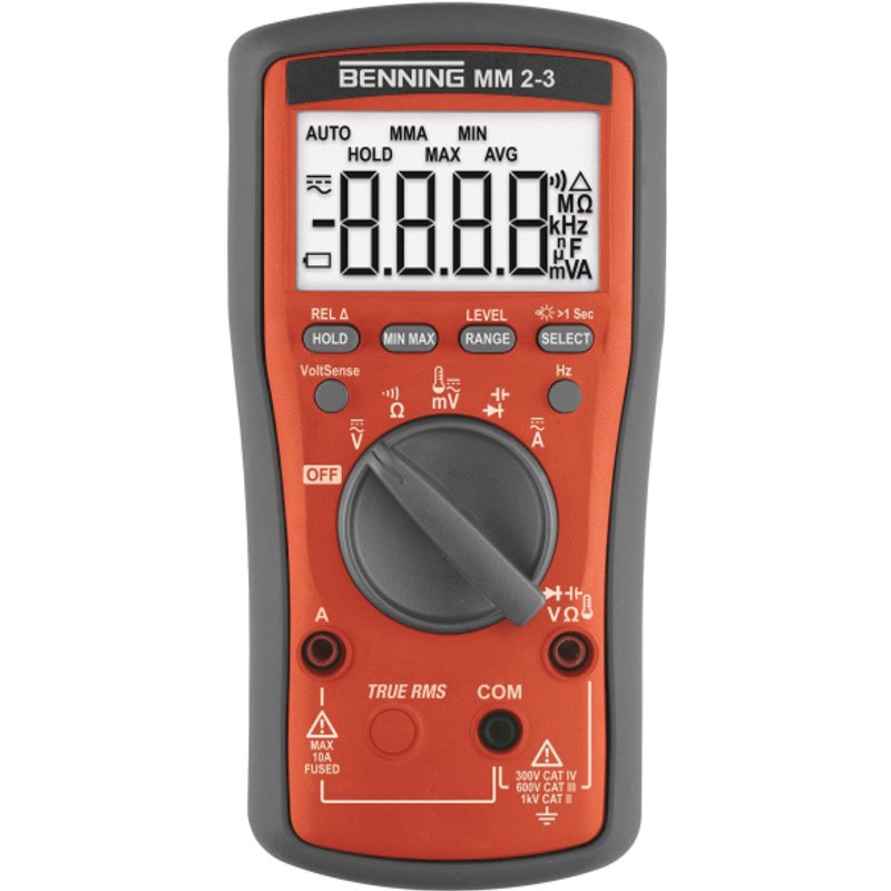 TRUE-RMS Digital-Multimeter MM 2-3 Spannung (0,01 mV - 600 V), Strom (1 mA - 10 A), Widerstand (0,1 - 60 M), Kapazität (0,01 nF - 10 mF), Frequenz (10 Hz - 50 kHz), Temperatur (-40 °C - +400 °C), Durchgangs-/Diodenprüfung optische/akustische Buchsenkontrolle (A-Bereich) mit Warnung Voltsensor zur berührungslosen und einpoligen Phasen- und Kabelbruchprüfung (optisch und akustisch) weitere Funktionen: HOLD, MAX/MIN/AVG, REL Messkategorie CAT IV 300 V, CAT III 600 V Inkl. Gummiholster, Tasche, Messleitungen, Drahttemperaturfühler, Batterien Anzeige digital Maßstabseinteilung linear nein Maßstabseinteilung logarithmisch nein Mehrfachanzeige nein Mit Bildschirmhintergrundbeleuchtung ja Messbereichswahl manuell/automatisch Max. Spannungsmessbereich AC 600 V Kleinste Auflösung Wechselspannung 0,01 mV Max. Spannungsmessbereich DC 600 V Kleinste Auflösung Gleichspannung 0,01 mV Max. Spannungsmessbereich, AC/DC 600 V Kleinste Auflösung Sp - Install.Baumaterial Werkzeug Messgeräte Messgeräte - Benning Dig.-Multimeter TRMS MM 2-3 1000V 10A 044693
