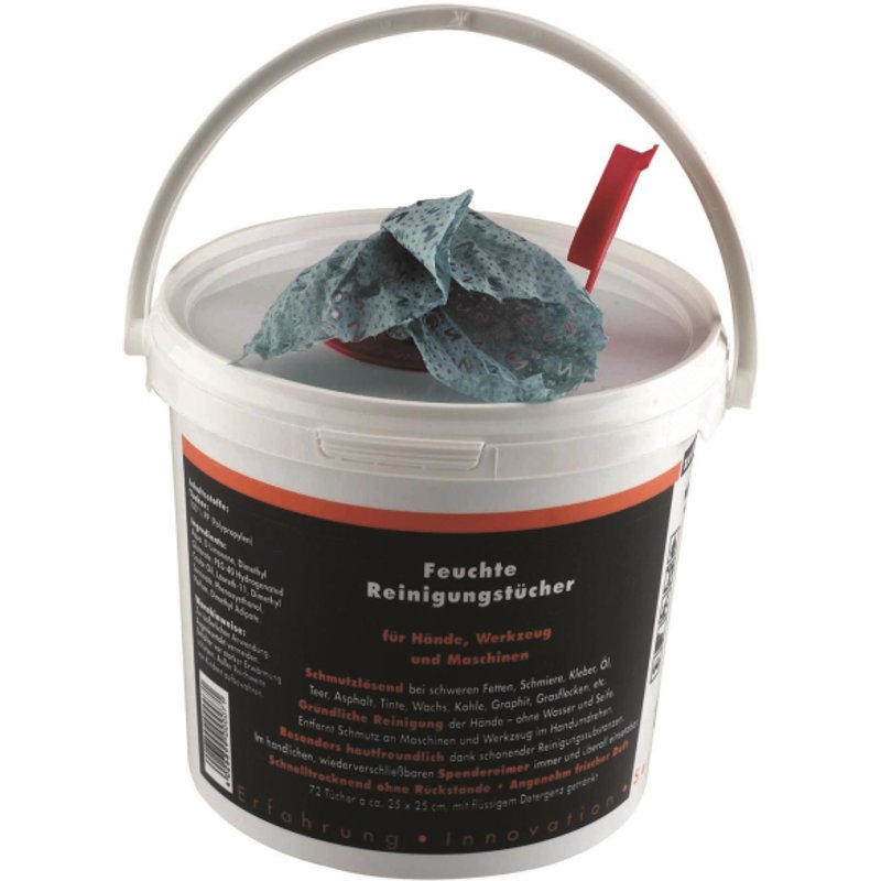 Feuchte Reinigungstücher Ideal, wenn mit gering dosierter Flüssigkeit gereinigt werden muss, um empfindliche Technik nicht zu gefährden, für Hände, Werkzeuge und Maschinen, entfernt Fette, Schmiere, Kleber, Öl, Teer, Asphalt, Tinte, Kohle, Graphit u. a. Verschmutzungen, feuchte Viskosetücher mit Textilcharakter, mit flüssigem Detergenz getränkt, schnelltrocknend ohne Rückstände, besonders hautfreundlich, angenehm frischer Duft, im handlichen, wieder verschließbaren Spendereimer mit 72 Tüchern. Länge 250 mm Breite 250 mm Mit Scheuerfläche nein Werkstoff Viskose Farbe blau Feuchttuch ja - Install.Baumaterial Werkzeug Messgeräte Werkzeug - Cimco Reinigungstücher 145018 72Stück im Eimer