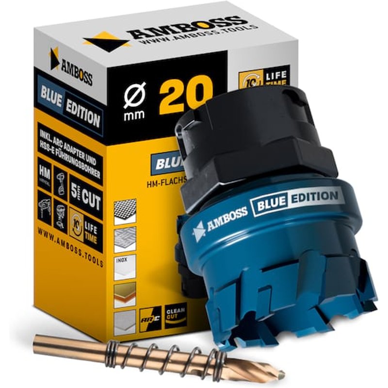 " Die Amboss Flachschnitt Lochsäge schneidet sauberste Löcher bis zu einer Tiefe von 5mm in Stahl- und Edelstahlbleche, die maximal mögliche Schnitttiefe beträgt 15mm. Ein spezieller Anschliff der HM Zähne ermöglicht noch schnellere Schnitte. Durch die Amboss Carbide Technology erreicht man eine extra lange Standzeit gegenüber Bi-Metall-Lochsägen. Die Amboss Blue Edition ist mit einem ARC Adapter versehen und nur mit dem ARC Schnellwechselsystem zu verwenden.
