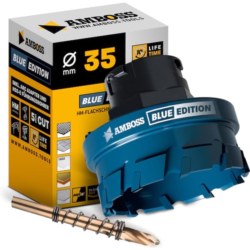 " Die Amboss Flachschnitt Lochsäge schneidet sauberste Löcher bis zu einer Tiefe von 5mm in Stahl- und Edelstahlbleche, die maximal mögliche Schnitttiefe beträgt 15mm. Ein spezieller Anschliff der HM Zähne ermöglicht noch schnellere Schnitte. Durch die Amboss Carbide Technology erreicht man eine extra lange Standzeit gegenüber Bi-Metall-Lochsägen. Die Amboss Blue Edition ist mit einem ARC Adapter versehen und nur mit dem ARC Schnellwechselsystem zu verwenden.