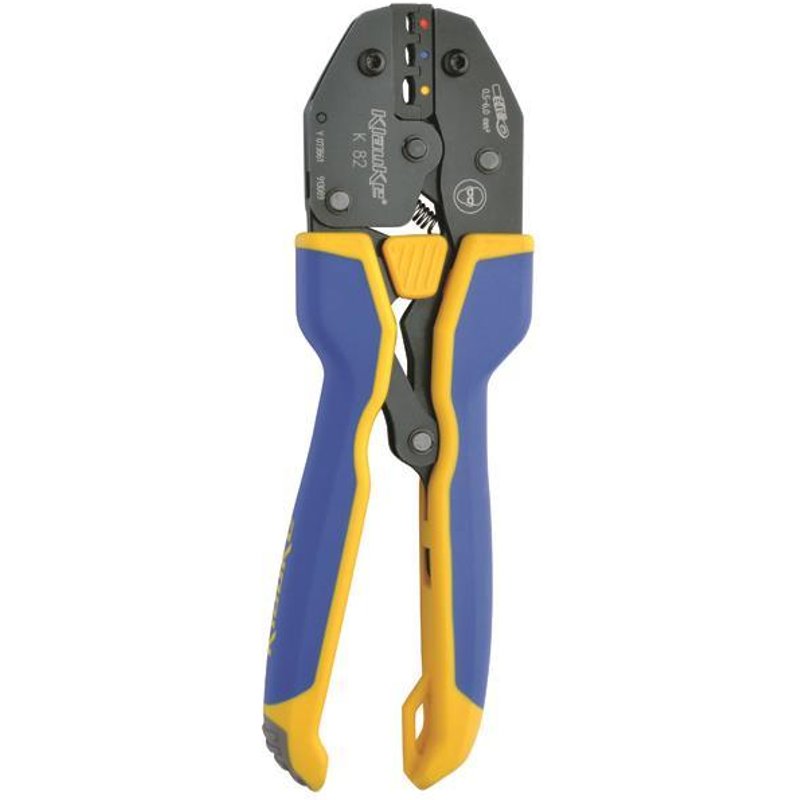 K 82 Presswerkzeug für isolierte Kabelverbindungen 0,5-6 mm 2 33 % weniger Kraftaufwand 3K-Griff Höchste Materialqualität für lange Lebensdauer Präzise Einstellung der Vorspannung für das Halten einer konstanten Pressleitung Weniger Kraftaufwand dank neuer Hebelmechanik 3-KGriff:GELB:harter Kern zur Kraftübertragung, BLAU:softe ergonomische Grifffläche, GRAU:softer Abgleitschutz Einfaches Handling dank reduzierter Öffnungsweite des Werkzeuges, optimale Ergonomie durch gelenkschonende Position der Handfläche und Finger Die Ader- und Isolationspressung erfolgt in einem Arbeitsgang Technische Daten Pressbereich gesamt:0,5-6,0 mm 2 rote Isolierhülse:0,5-1,0 mm 2 blaue Isolierhülse:1,5-2,5 mm 2 gelbe Isolierhülse:4,0-6,0 mm 2 Länge:225 mm Gewicht:0,53 kg Geeignet für Kabelschuhe und Verbinder Querschnitt 0.5 - 6 qmm Min. AWG-Größe 20 Max. AWG-Größe 10 Länge 225 mm Mit Sperrvorrichtung (bei mechanischen Werkzeugen) ja Ausführung/Betätigung mecha - Install.Baumaterial Werkzeug Messgeräte Werkzeug - KLAU PRESSWERKZEUG, K82A f.ISOL.KABELVERBINDUNGEN