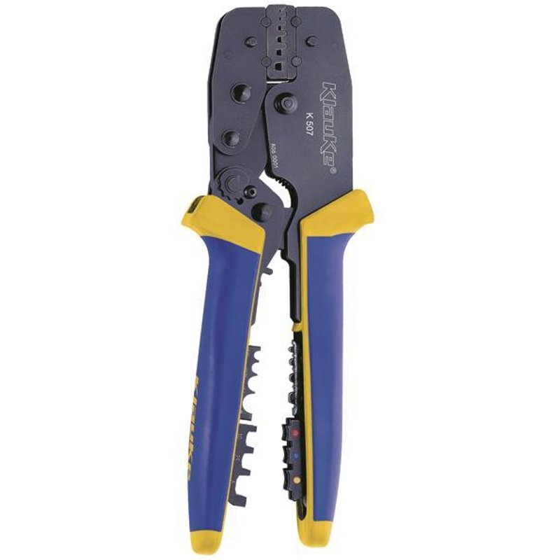 Presswerkzeug K507 mit ausweichselbaren Einsätzen Die K 507 mit zwei besonders vorteilhaften Funktionen: 1. Auswechselbare Presseinsätze, die durch Verriegelungsstifte in Sekundenschnelle ausgetauscht werden können. 2. Die Zangengriffe sind als Magazine ausgebildet, in denen zwei weitere Presseinsätze aufbewahrt werden können. Technische Daten Länge:220 mm Gewicht:635 g inkl. 3 Einsätze Lieferumfang: Zange inkl. 3 Paar Einsätze IS50710,6-6 mm 2 isolierte Kabelschuhe AE5010,5-10 mm 2 isolierte und nichtisolierte Aderendhülsen Q5010,5-10 mm 2 nichtisolierte Kabelschuhe Geeignet für verschiedene Anwendungen Pressform universal (Wechseleinsätze) Querschnitt 0.14 - 10 qmm Max. AWG-Größe 1 Länge 220 mm Mit Sperrvorrichtung (bei mechanischen Werkzeugen) ja Ausführung/Betätigung mechanisch Einsätze auswechselbar ja Anzahl der mitgelieferten Einsätze 3 Mit automatischem Rücklauf nein - Install.Baumaterial Werkzeug Messgeräte Werkzeug - KLAU Presszange K507