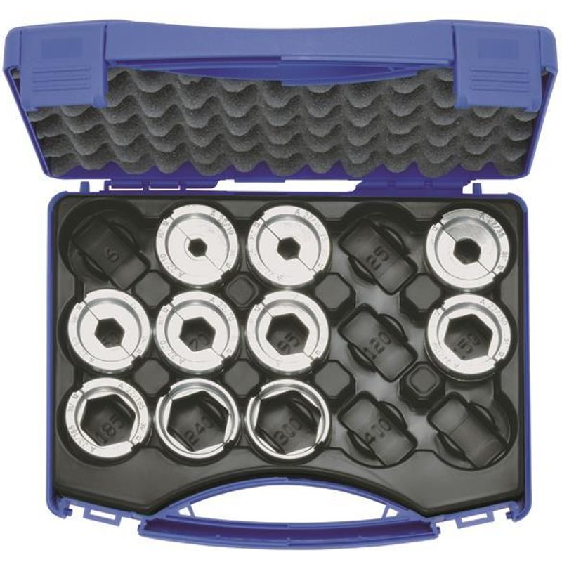 Presseinsatzset 10-300 mm 2 A 22 im Kunststoffkoffer, 11-teilig geeignet für Presskabelschuhe und Verbinder nach DIN - Al Presskabelschuhe und Verbinder Al/Cu (Aluminiumseite) Anwendung Presskabelschuhe und Verbinder Pressform Sechskant (hexagonal) Querschnitt 10 - 300 qmm - Install.Baumaterial Werkzeug Messgeräte Werkzeug - Klauke Presseinsatzset K22er A A22SET 10-300qmm im KS-Koffer 11tlg