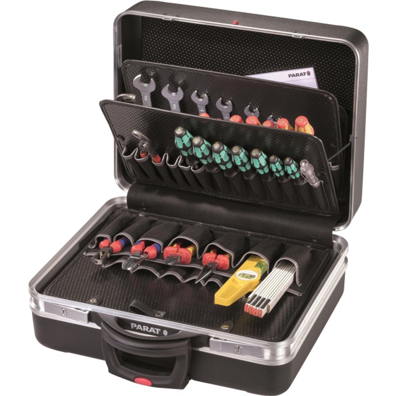 Werkzeugkoffer CLASSIC KingSize Roll Unbestückt, rollbar Der PARAT Rollen-Werkzeugkoffer CLASSIC im King-Size-Format fasst insgesamt bis zu 50 Werkzeuge in den dafür vorgesehenen hochwertig genähten Einsteckfächern. Insgesamt verfügt der CLASSIC KingSize Roll über zwei Werkzeugtafeln mit genähten Separationen, einer frei unterteilbaren Bodenschale für Kleinteile und der dazugehörenden Abdeckplatte mit weiteren Einsteckfächern. Hinzu kommen zwei Fächer für Visitenkarten und zwei Stiftschlaufen sowie ein Dokumentenfach im Kofferdeckel. Er verfügt über einen Doppel-Aluminiumrahmen und ist bis 30 Kilogramm belastbar. Das integrierte Trolley-System mit Leichtlaufrollen und Teleskopauszugsgriff sorgt für einen komfortablen Transport des Koffers von A nach B. Der CLASSIC KingSize Roll besitzt Rasterscharniere mit einer praktischen Kofferdeckel-Arretierung sowie Kippzylinderschlösser, die den Inhalt vor ungewolltem Zugriff schützen. Der PARAT Premium-Werkzeugkoffer ist ideal für all jene Ha - Install.Baumaterial Werkzeug Messgeräte Werkzeug - Parat Werkzeugkoffer 489500171 CLASSIC KingSize Roll unbestückt