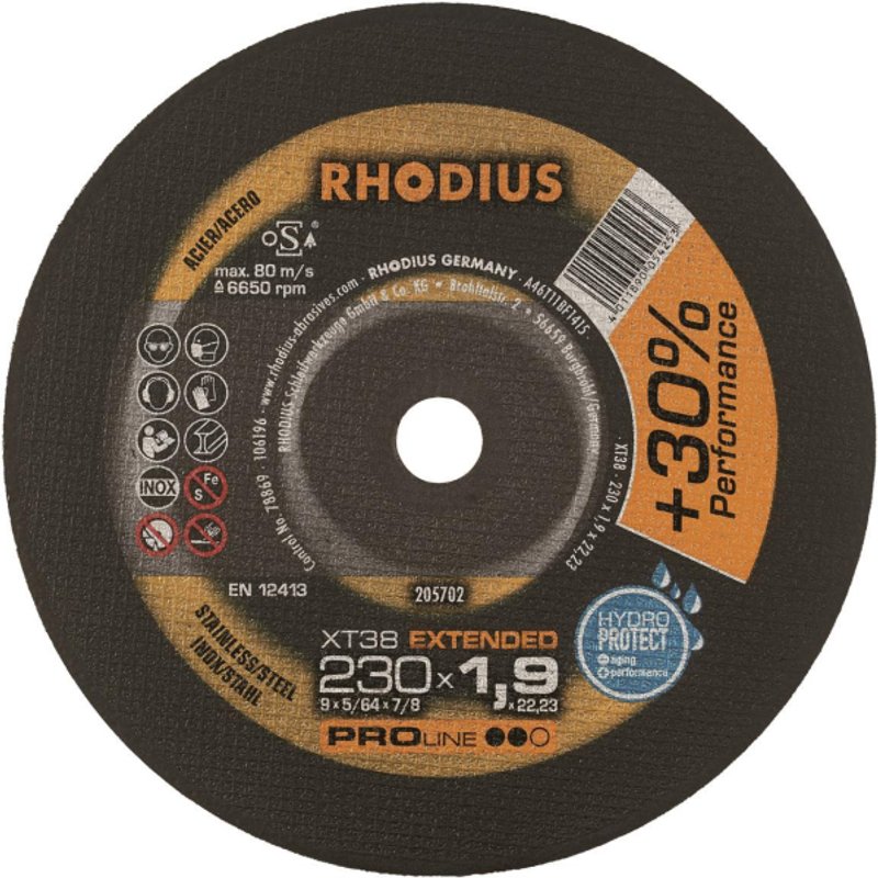 Extradünne Trennscheiben XT38 Edelstahl Extradünne Trennscheibe mit hoher Standzeit bei optimalem Preis-Leistungs-Verhältnis. Ideal für antriebsschwache Maschinen. Geringe Gratbildung Hohe Schnittgeschwindigkeit Geringer Funkenflug Eigenschaften: Lebensdauer:4/6 Schnittigkeit Vollmaterial:4/6 Schnittigkeit dünnwandiges Material:5/6 Qualität:Proline Stärke:1,9mm Materialeignung:Edelstahl / Stahl Sicherheitshinweise:Eisen- und Schwefelfrei Geschwindigkeit:80 m/s Maschineneigung:Freihandwinkelschleifer Produktabmessung:230 x 1,9 x 22,23 Maximale Drehzahl:6650 U/min - Install.Baumaterial Werkzeug Messgeräte Werkzeug - Rhodius Trennscheiben XT 38 205702 230x1,9x22,23 Extradünn Edelstahl