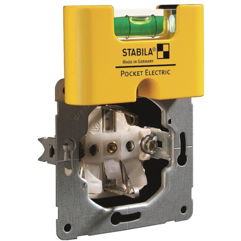 Wasserwaage Pocket Electric, 7 cm mit Seltenerd-Magnetsystem und Gürtel-Clip Kunststoff-Wasserwaage für schnelles und sicheres horizontales Ausrichten von Unterputz-Schaltern und -Steckdosen dank starkem Seltenerd-Magnetsystem, Sockelmessfläche auf der Rückseite der Wasserwaage und cleverer Aussparung für die Schraubendreher-Führung. Das Einbauteil kann mit der aufgesetzten Wasserwaage bequem justiert werden. Mit original großer STABILA Präzisionslibelle. Artikel 18115 zusätzlich mit Gürtel-Clip. - Install.Baumaterial Werkzeug Messgeräte Werkzeug - Stabila Mini-Wasserwaage 17775 Pocket Electric mit Magnet